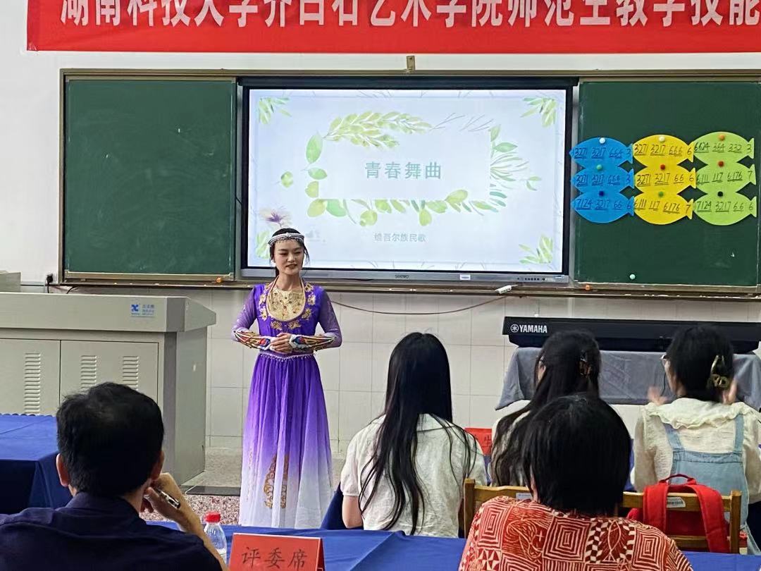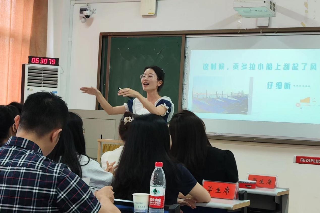 本次大赛分文理科组现场进行,包括教育问答和授课环节两个,在教育问答环节,三位同学沉着冷静,信心十足,充分展现了扎实的理论基础和显著的学习效果,在授课环节雷雨同学从容不迫,全身心投入讲课,将教授内容与课堂氛围巧妙结合,身着民族服饰带领学生用身体感受音乐,最终凭借富有创意的教学设计、灵活的细节把控以及较强的综合素质在本次大赛文科组中脱颖而出,斩获第六名。邓玉苹同学的课堂感染力也很强,也十分强调师生互动,兼具优秀的音乐专业素养,教唱环节与奥尔夫打击乐器编创环节的课堂氛围十分活跃,教学环节设计也紧扣教学目标,收到评委老师的一致好评,取得了第九名的好成绩。周佳铭同学通过与古诗句结合把大家引入所学的古筝曲中,让学生对民族乐器有所了解并体验古筝的弹奏技法,又通过唱和晚的描述使人身临其境,教学设计环环相扣,最终收获了第十名的好成绩。