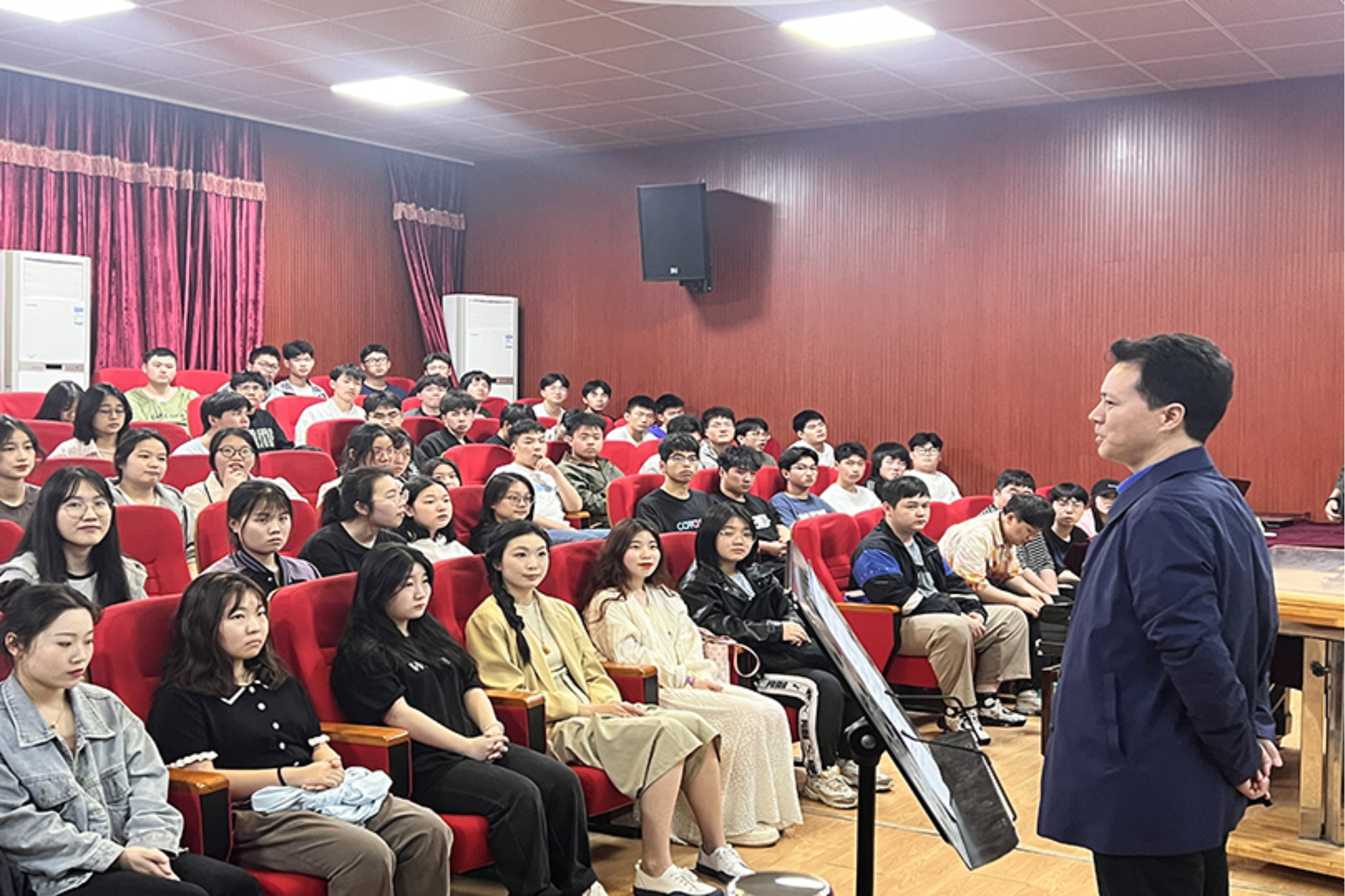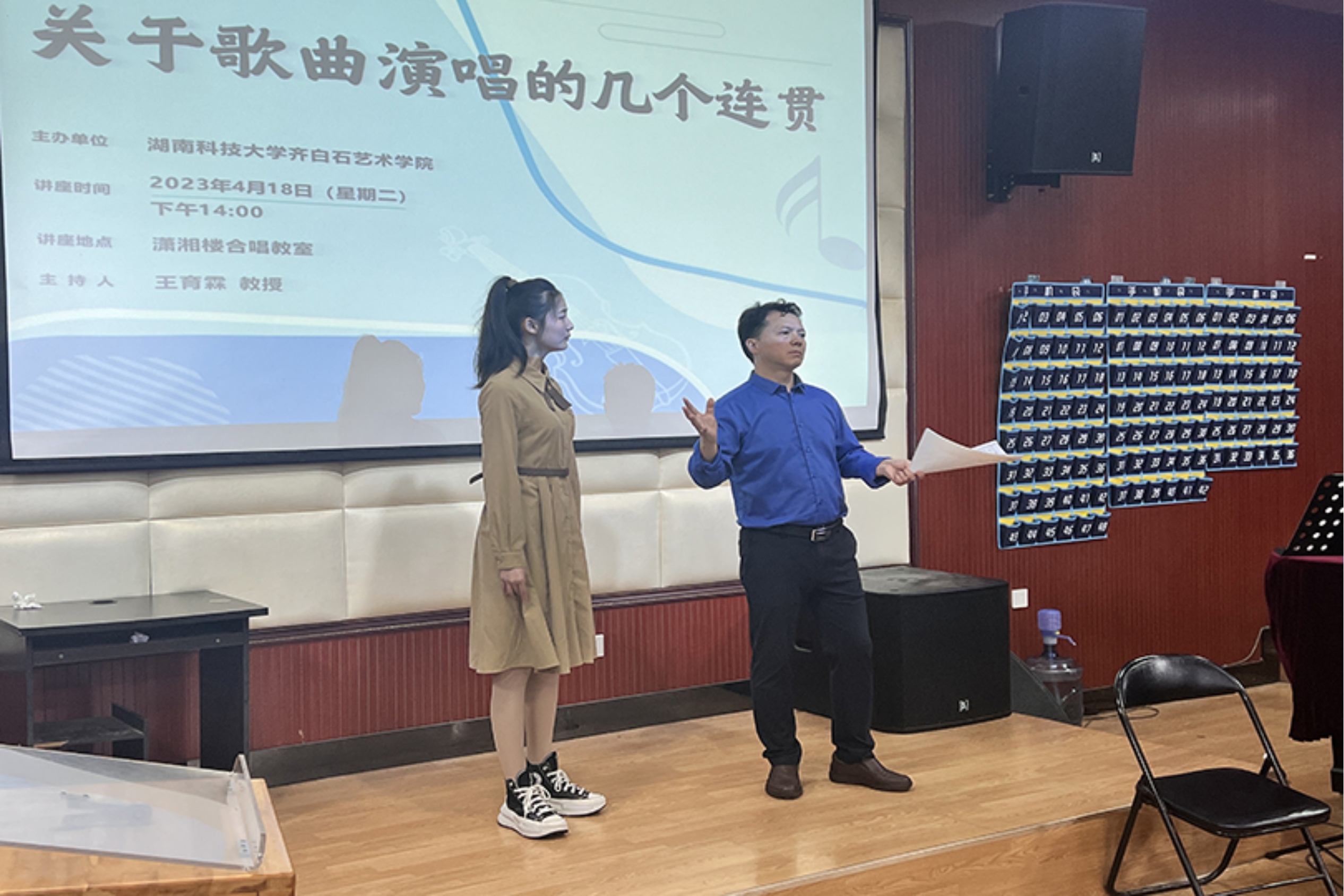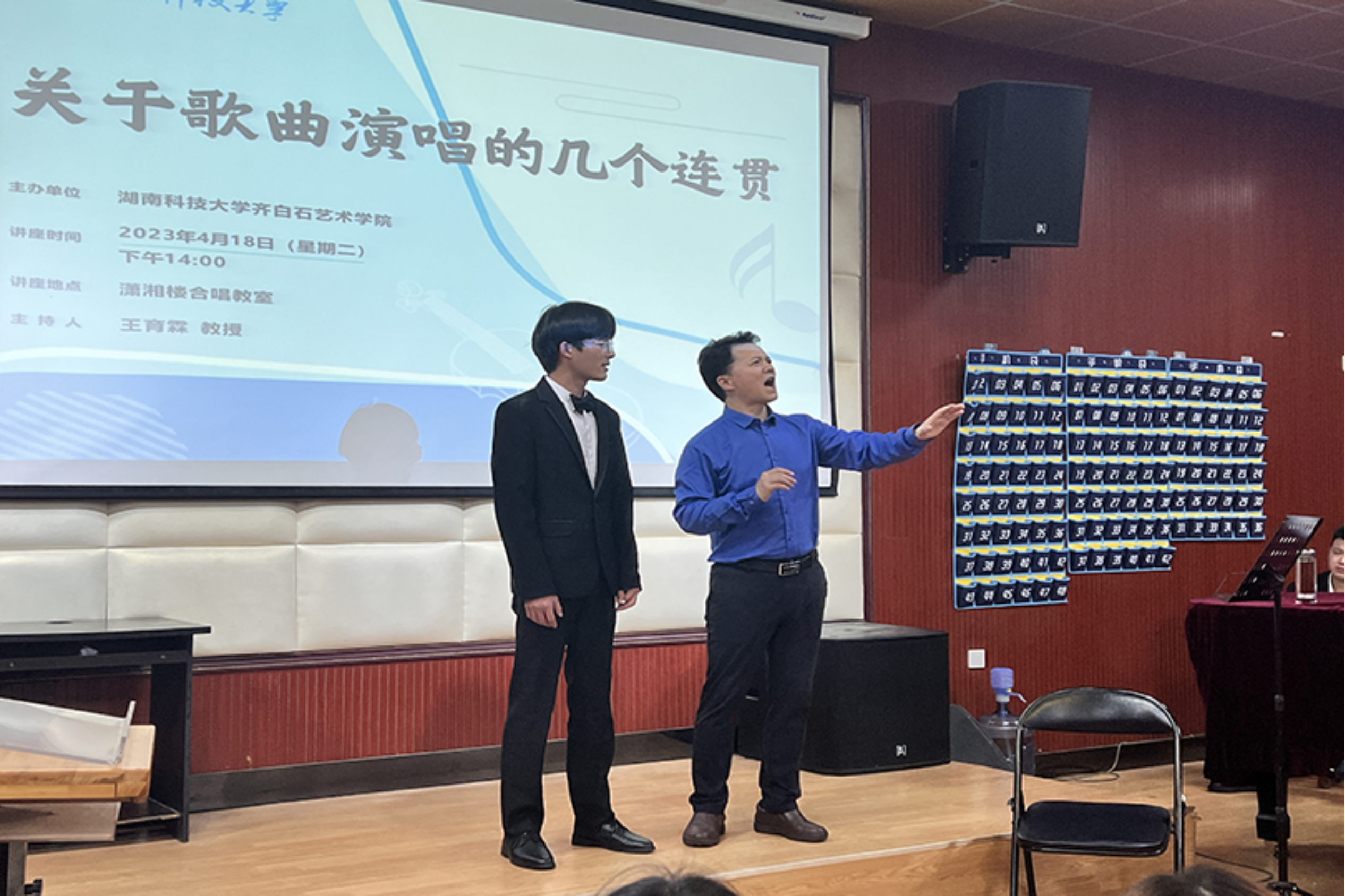 为进一步提升伦理影片 音乐系声乐教学质量,提高学生声乐演唱水平,4月18日下午,伦理影片 特别邀请到了马关辉教授在音乐系合唱教室开展主题为《关于歌曲演唱的几个连贯》的专题讲座,由伦理影片 副院长王育霖教授主持本次讲座。讲座以声乐公开课的形式开展,音乐系师生与会参加。