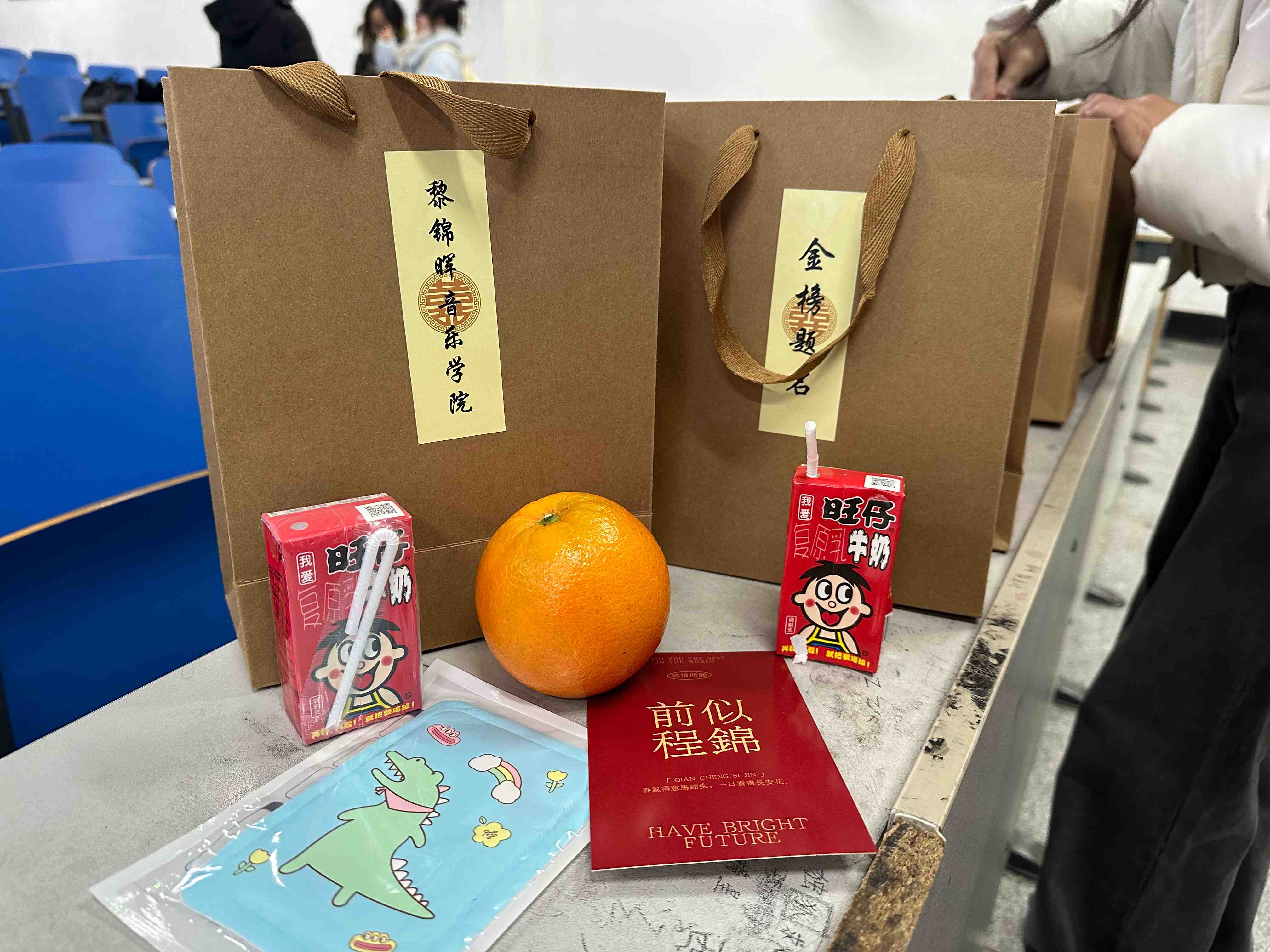 最后学院领导及老师们为考研学子送上贴有“金榜题名”的慰问福袋,并附上领导老师亲笔书写的祝福卡片。礼轻情意重,小小的福袋饱含学院满满的祝福。